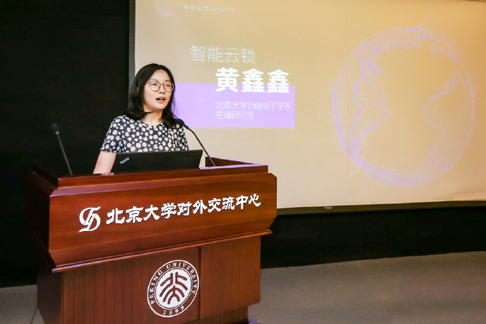 (Huang Xinxin, a current graduate student of Department of Electronics of Peking University presents her project.)