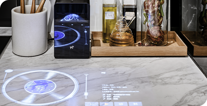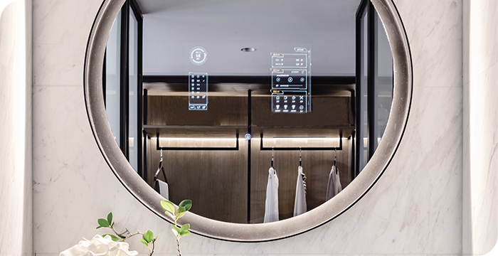 走进洗漱间,智能镜子“致镜”可让用户在洗漱的同时听音乐、看新闻、查天气,还可提醒用户有待取的快递或者预约呼叫无人车出行; 在浴室,跌倒报警器、地面烘干机、智能暖风机、浴室控制面板提供了安全、舒适的居住空间。